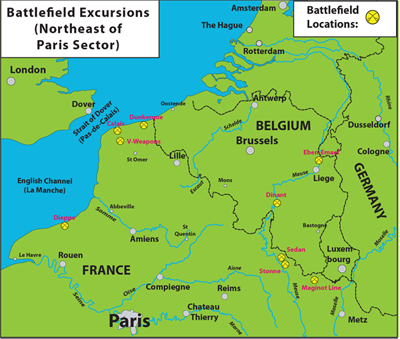 Excursions in this sector review the battlefields of the 1940 invasion of Belgium and France, evacuation of British forces from the continent, German Atlantic wall defenses, and early Allied attempts to penetrate those defenses. The map linked can be used to locate sites of interest in this sector. The battlefield locations links provide access to the individual excursion chapters. New battlefield excursions will be added as they are developed.